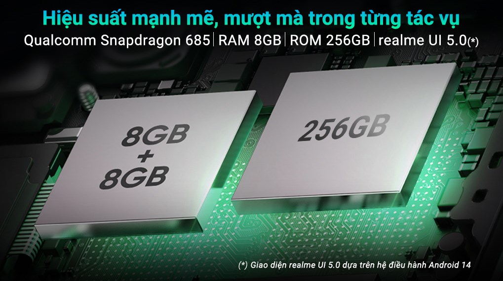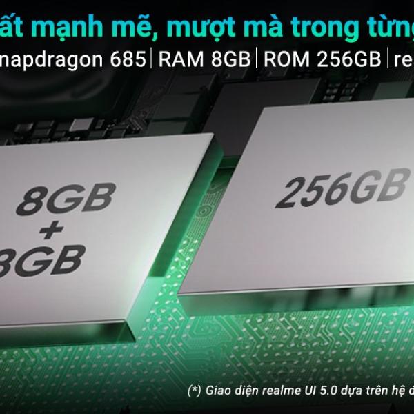 realme 12 được trang bị vi xử lý 8 nhân Qualcomm Snapdragon 685 mạnh mẽ, mang đến hiệu suất tuyệt vời cho mọi nhu cầu, từ chơi game đồ họa đến xử lý đa nhiệm mượt mà. Đi kèm là hệ thống tản nhiệt buồng hơi với diện tích lớn lên đến 4392 mm², giúp thiết bị luôn giữ được sự mát mẻ dù bạn có sử dụng liên tục trong thời gian dài.
