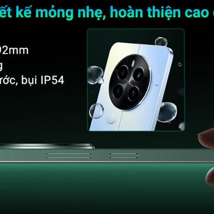 Mỏng chỉ 7.92 mm và nặng vỏn vẹn 187g, chiếc điện thoại Android này mang lại sự nhẹ nhàng thoải mái khi cầm, dù sử dụng một tay hay kéo dài thời gian trải nghiệm. realme 12 còn được trang bị chuẩn kháng nước và bụi IP54, bảo vệ thiết bị trước những thách thức từ môi trường xung quanh.