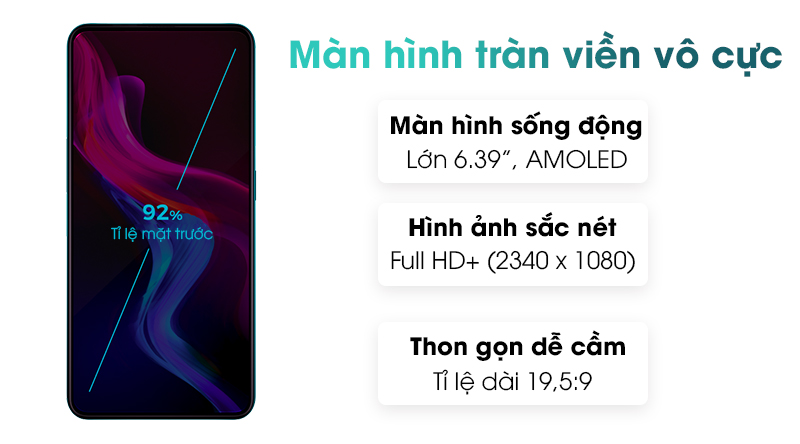 Vsmart Active 3 sở hữu màn hình tràn viền 6.39 inch với phần viền siêu mỏng, chiếm đến 92% tỉ lệ mặt trước máy, mang đến không gian sử dụng cực thoải mái. Tấm nền AMOLED cho hình ảnh sống động và tươi sáng, nịnh mắt hơn.