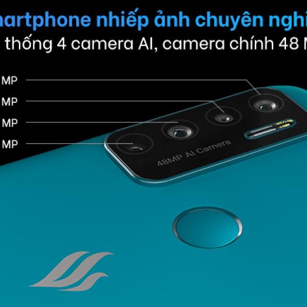 Mặt sau nổi bật với cụm 4 camera hình chữ nhật. Với camera chính 48 MP, camera góc siêu rộng 8 MP, camera xoá phông 5 MP và camera chụp macro 2 MP. Máy cũng được trang bị công nghệ AI Camera, chế độ chụp đêm Night Mode, chụp chuyên nghiệp (Pro) và nhiều chế độ khác.