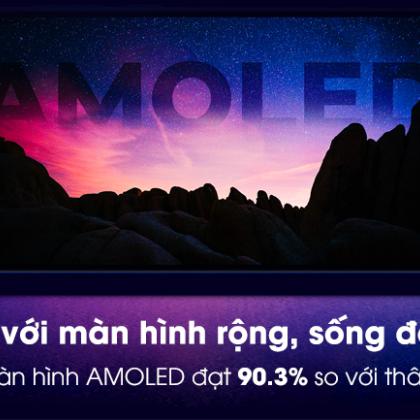 Máy được trang bị màn hình AMOLED kích thước 6.2 inch độ phân giải Full HD+ cho khả năng hiển thị hình ảnh độ tương phản cao, màu sắc rực rỡ, ấn tượng cùng khả năng tiết kiệm điện năng tốt.